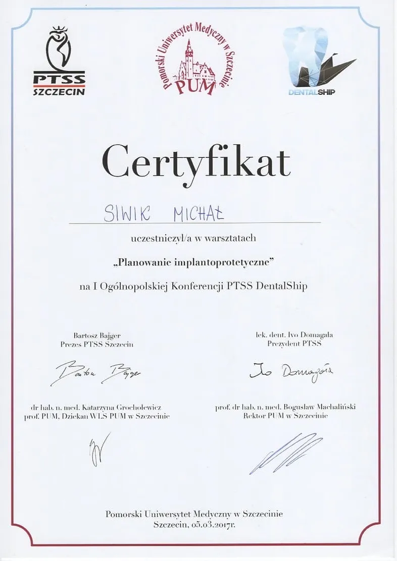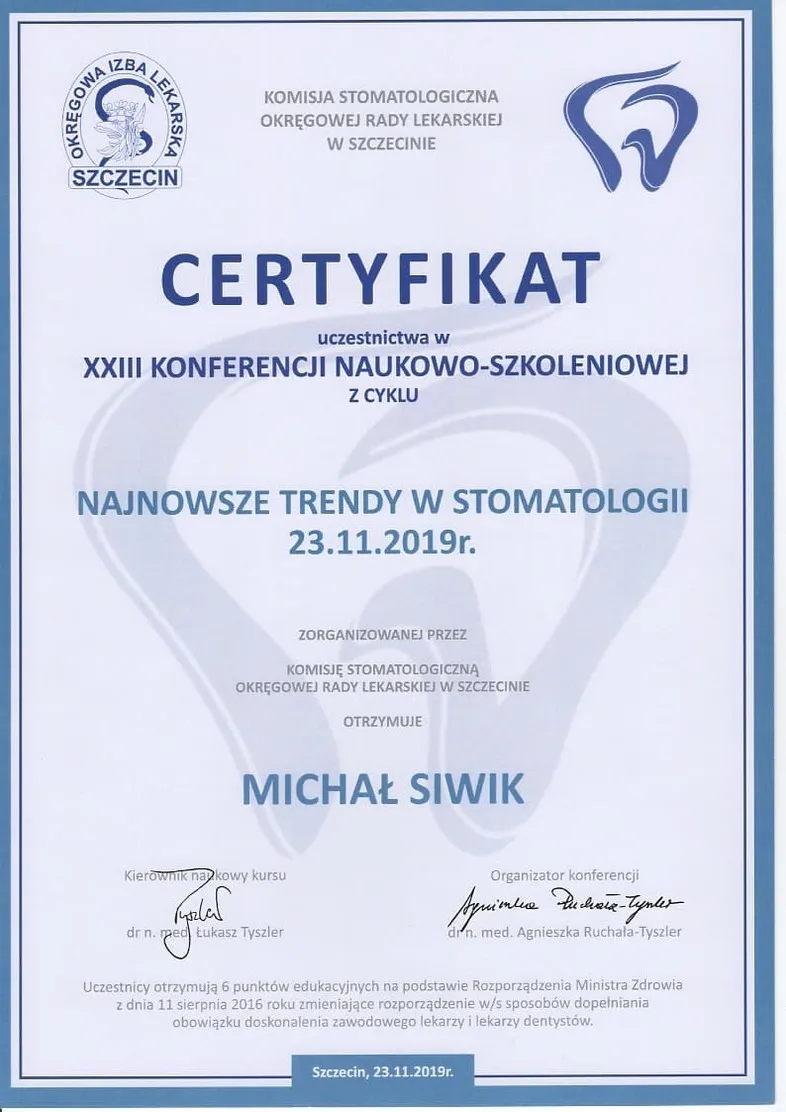 Schloss 2016 sein Studium an der Pommerschen Medizinischen Universität in Szczecin ab. Er beschäftigt sich hauptsächlich mit Kariesbehandlung, Endodontie und Prothetik. Sie legt Wert auf hohe Präzision, die sie durch den Einsatz von Geräten wie einem Dentalmikroskop, einer Spiegelreflexkamera und einem Intraoralscanner bei ihrer täglichen Arbeit erreichen kann. Er legt großen Wert auf die Prävention und die Aufklärung der Patienten über Mundgesundheit. Privat ist er Vater von zwei Kleinkindern: Igor und Szymon. Er genießt guten Kaffee in großen Mengen und Science-Fiction-Literatur.